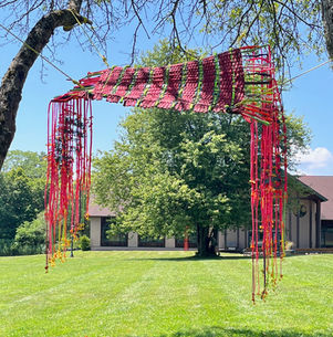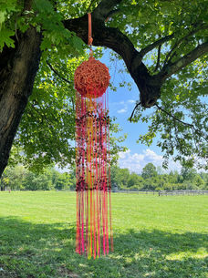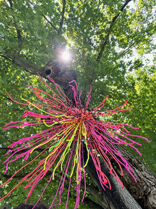 Suspended from the branches of trees on the campus of Kaatsbaan Cultural Park in Upstate New York, my woven sculptures Cautionary Tails and Trees and Fire (both 2025) incorporate a variation of the Andean khipu—an ancient Inca record-keeping system made of knotted strings. To create these works, I tied colorful rope around small found objects—children’s toys and toy-sized water chestnut seed pods—interweaving domestic and natural memories.