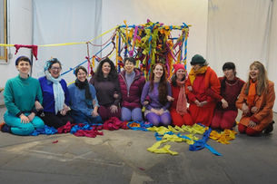 The first Communal Vortex Weave took place on February 23, 2019, at the Three Phase Center in Stone Ridge, NY, bringing together ten visionary women from the Hudson Valley. Over the course of three hours, participants engaged in a collective action—part ritual, part movement—dissolving the perception of time as they co-created a technicolor torus.
